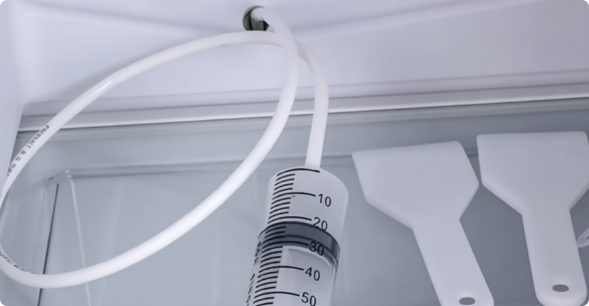 Слейте воду из поддона под компрессором, расположенного сзади (объем 200-500 мл). Наденьте перчатки для защиты от плесени. Протрите дно камеры микрофибровой тканью, впитывая остатки влаги (до 100-200 мл конденсата за цикл).