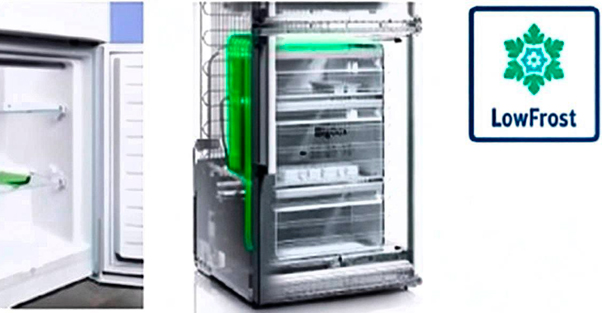 Low Frost минимизирует образование инея за счёт эффективной вентиляции. Частота разморозки составляет 1–2 раза в год, или при образовании наледи толщиной 3 мм, что снижает необходимость оттаивания на 50% по сравнению с ручной системой.